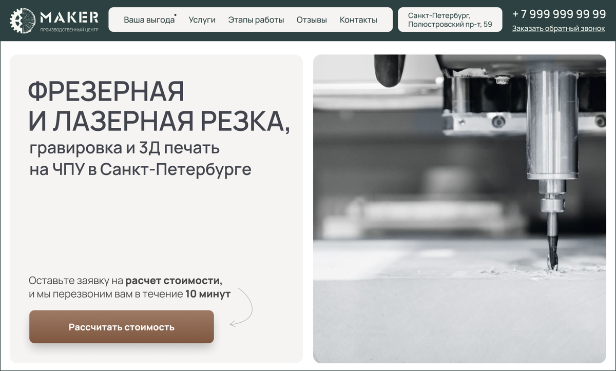 Так, мы создали сайт для компании, которая занимается фрезерной и лазерной резкой в Санкт-Петербурге