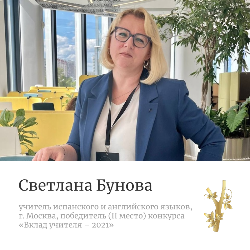 Светлана Бунова, учитель испанского и английского языков, г. Москва, победитель (2 место) конкурса «Вклад учителя – 2021», призёр в номинациях «Я эти строки обращая к юным...», «Герои медиа»; 20 сентября
