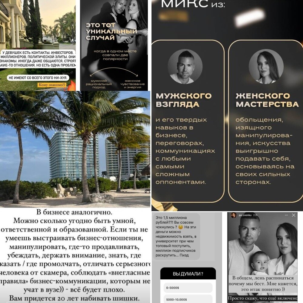 Мне всегда было интересно читать про приключения великого комбинатора Остапа Бендера, поэтому в Инстаграм (признан экстремистским) я подписана на аккаунт Светланы, бывшей эскортницы-психолога с нарциссическим расстройством, которая пытается продавать курсы по женственности по диким ценам. Я писала про нее раньше. А вторая реинкарнация великого комбинатора - это аккаунт Алисы, которая в начале рассказывала про то, что в эскорте можно научиться «коммуникации» с мужчинами, потом о своих трех браках с миллионерами, покупке горы, участии в выставках собак, якобы переходе границы Мексика США с грудным младенцем и третьим текущим мужем миллионером, о нянях, вложении денег в золото, о жизни в Мексике и о том, что они перевезли туда ее мать и деда, но потом эти персонажи куда-то потерялись.