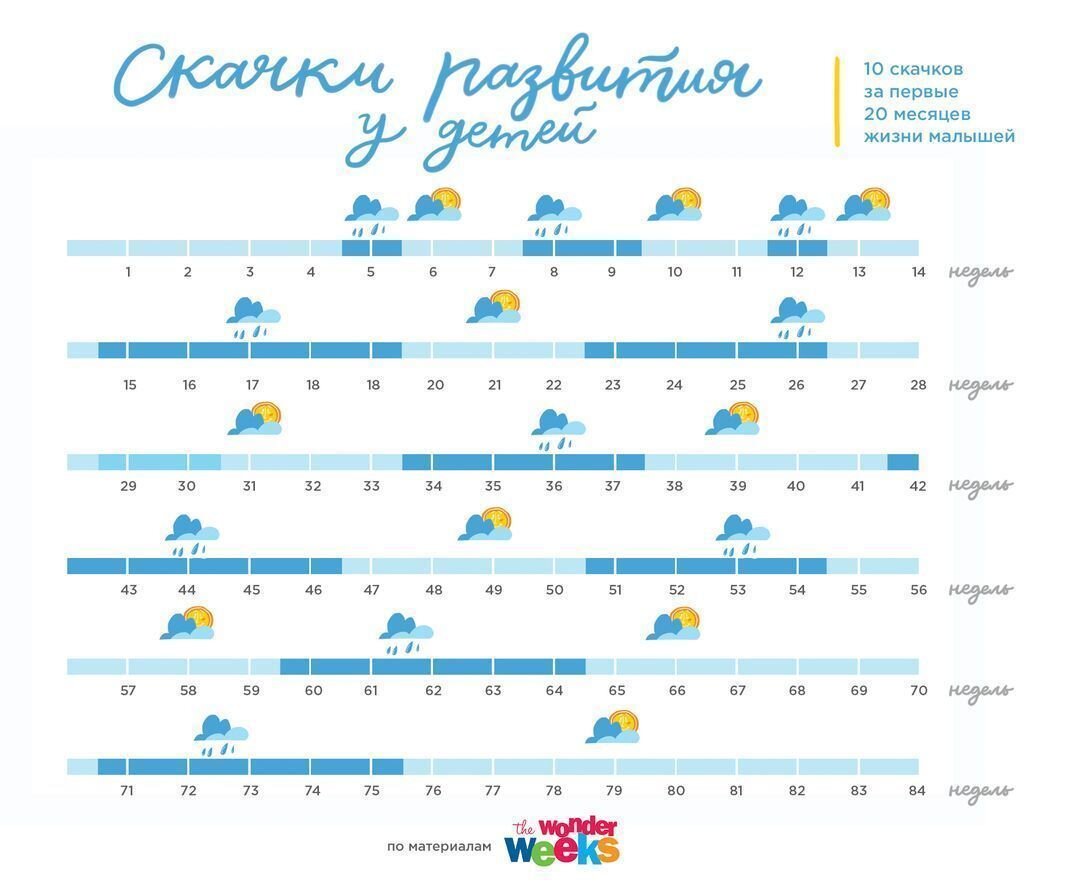 Хорошо изучены первые 10 скачков развития (https://spimalysh.ru/vse-o-sne/nauka-sna/skachki-razvitiya-rebenka) от 0 до 20 месяцев. Эти скачки одинаково проявляются у всех здоровых младенцев и происходят примерно в одно время. Авторами концепции The Wonder Weeks был составлен календарь скачков развития, который поможет сделать вашу жизнь чуть более предсказуемой и простой 🙃
