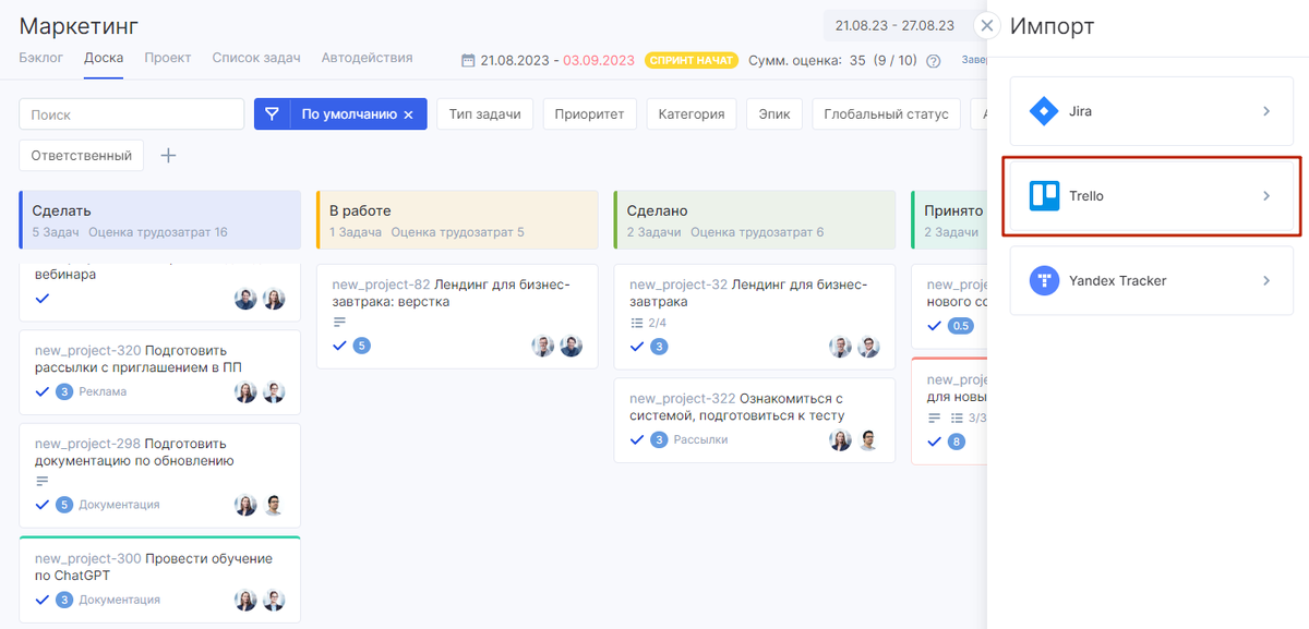 В Аспро.Agile уже доступен импорт проектов и задач из Jira и Yandex Tracker. Теперь же данные проектов можно выгрузить и из Trello. Перенос осуществляется в несколько кликов. Установка дополнительных модулей или получение API-токена не требуется. Просто выберите нужную доску и установите соответствие между сущностями в обеих системах. Подробнее о переносе задач из Trello читайте в документации. Чтобы упростить доступ к импорту задач, мы переработали виджет, который можно добавить на дашборд стартового экрана. Попробуйте Аспро.Agile — первые 14 дней бесплатно.