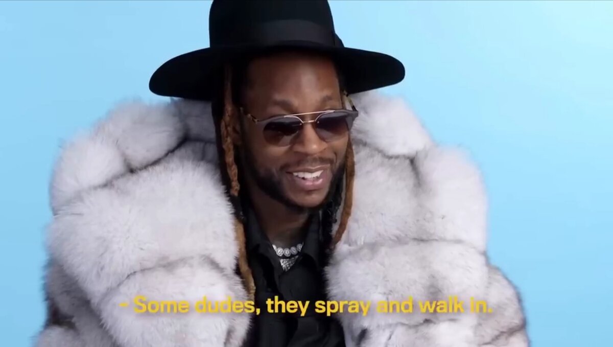 В полном интервью известному модному журналу рэпер показывает свой одеколон (кстати, какой бы концентрации не были их парфюмы, парни называют их просто "одеколон")