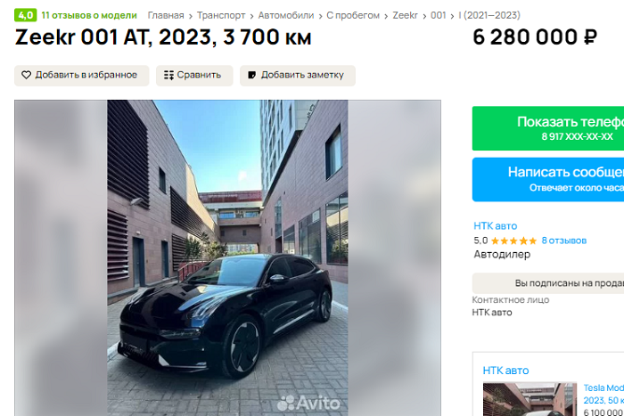 Привет, уважаемая публика! В конце августа делал обзор электромобилей с пробегом, которые находились на тот момент в продаже у автодилеров нашего города. И я подумал: почему бы не делать такие обзоры ежемесячно? Сегодня представляю вашему вниманию обзор на начало октября 2023 года. Напомню, что я рассматриваю только электрички с левым рулём, с пробегом (более 500 км) и анализирую только дилерские площадки, на которых у вас есть возможность приобрести машину в кредит, а также воспользоваться услугой "трейд-ин". В конце августа удалось найти 7 предложений, ценовой диапазон тогда был 5 520 000 - 14 700 000 руб. Что ж, посмотрим, как обстоят дела в октябре. компании перечисляю в алфавитном порядке. HTK Auto В поиске на Авито нашёл один вариант электромобиля с пробегом от компании "HTK Auto" - слышали что-нибудь о такой? 1. Zeekr 001 (2023) Полноприводная машина 2023 года выпуска с пробегом 3700 км предлагается за 6 280 000 руб. Автосеть В "Автосети" как не было электричек с пробегом месяц