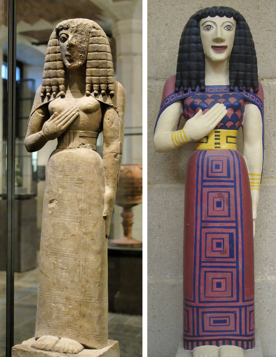 История с человечеством постоянно играет в прятки, привлекая Природу, чтобы скрыть свои тайны. Но, с археологами такой фокус не пройдёт... 1) Мы привыкли восторгаться красотой древнегреческой скульптуры, но так было не всегда. Понять это нам поможет Дама из Осера (La Dame d'Auxerre), по одной из версий, самое раннее изображение Персефоны. 75 см высотой из VII в. до н. э. Вывезли её с Крита, долго стояла/лежала в запасниках музея французского городка Осер, а в 1907 году про неё вспомнили и перевезли в Лувр. Чем же так интересна эта архаическая Дама, а тем, что она демонстрирует один из самых ранних этапов развития греческой скульптуры, переходную фазу от рельефной статики к более сложным художественным техникам и формам. Вся такая симметричная и "непостоянная", сложена из блоков (руки и туловище не одно целое). Смотреть на Даму предполагалось фронтально, так как боковые стороны не проработаны. Греки ещё не нашли свой стиль, поэтому в скульптуре много от крито-микенского и египетского.