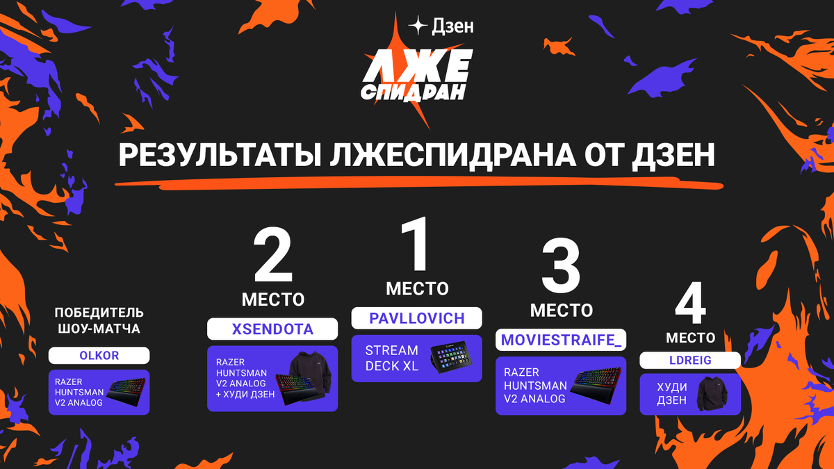 Вот и подошел к концу наш турнир и мы рады объявить результаты! Чемпион турнира - PAVLLOVICH! Он выигрывает Stream Deck XL. 2 место - XSENDOTA. Он забирает Razer Huntsman V2 Analog + Худи Дзена. 3 место - MOVEISTRAIFE_ . Ему достается Razer Huntsman V2 Analog. 4 место - LDREIG. Тут призер лутает Худи от Дзена. В нашем шоу-матче лучших авторов в жесткой схватке в игре "Мадагаскар" победу одержал OLKOR. Ему отправляется Razer Huntsman V2 Analog. Всем участникам большое спасибо за великолепную игру, а зрителям за просмотр! Ну а если хотите увидеть еще один ЛЖЕСПИДРАН от Дзена, то можете уже прямо сейчас подавать заявки для участия в этой форме Всем хорошей недели!