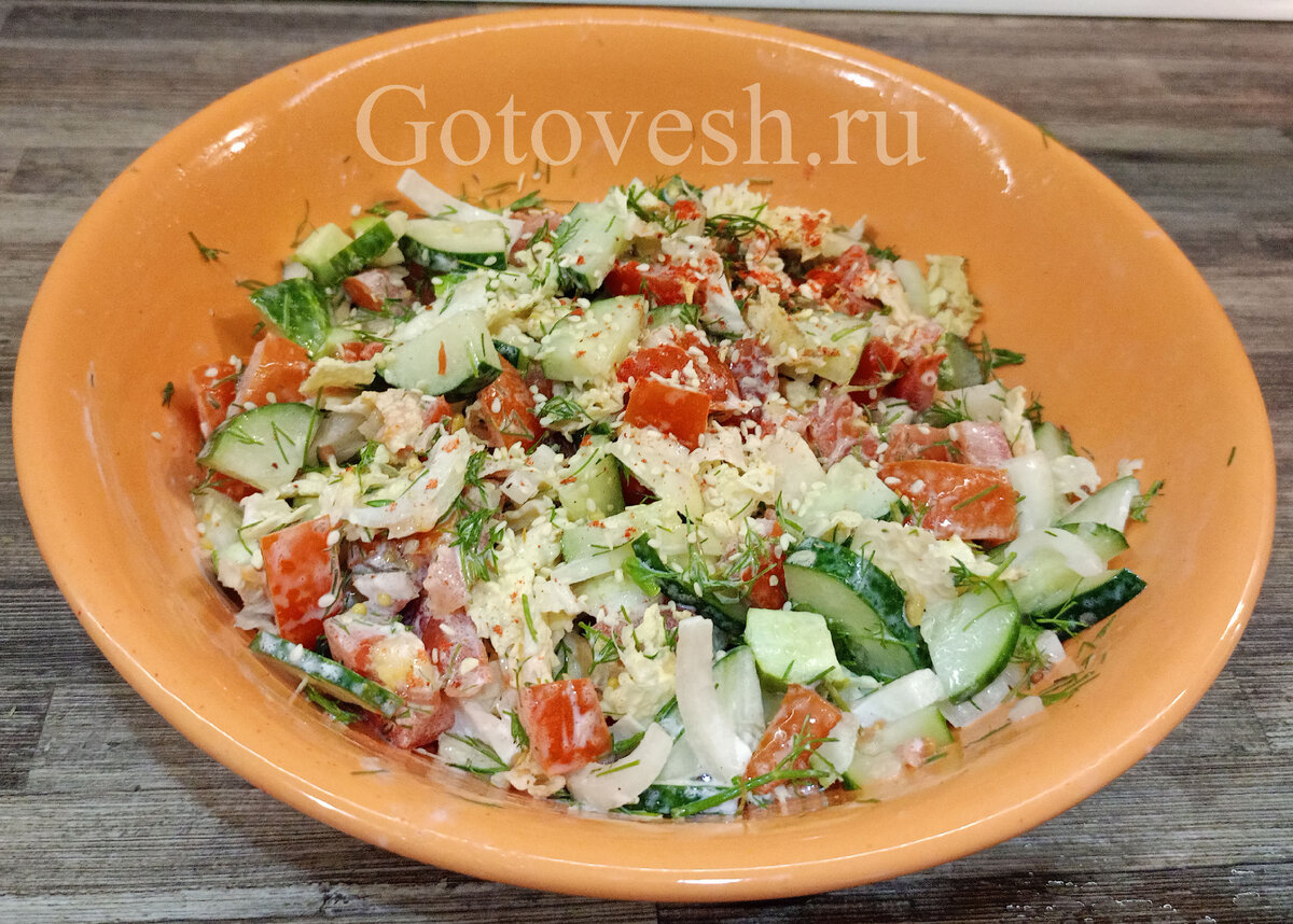Ингредиенты: - помидоры – 2 шт - огурцы – 2 шт - пекинская капуста – 3 листа - лук – 1 маленькая головка - укроп – небольшой пучок - майонез – 3 ст.ложки - горчица французская – 1 ч. Ложка - соль – 1 я. Ложка - перец – 0,5 чайной ложки Способ приготовления: 1. Все продукты тщательно промыть холодной водой. 2. Помидоры порезать кубиками, лук – полукольцами, пекинскую капусту нашинковать, укроп измельчить. 3. Все выложить в салатник, заправить майонезом, горчицей, посолить, поперчить. И подавать к столу. Приятного аппетита!