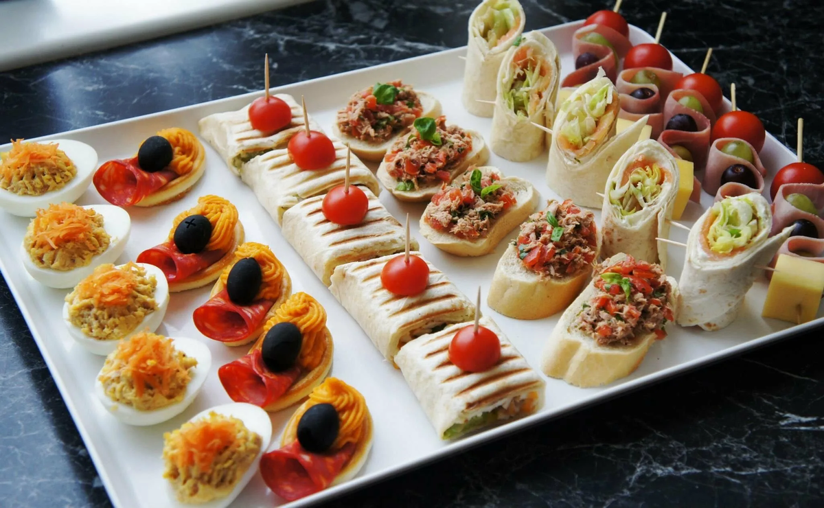 1. Брускетта с помидорами и базиликом: 2. Гренки с чесночным маслом: 3. Лосось на тосте: 4. Мини пицца: 5. Красная икра на блинчиках: