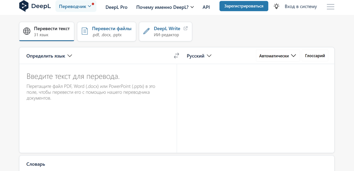 Deepl - это переводчик, который использует нейронные сети для своей работы. Один недостаток - ограниченный выбор языков по сравнению с другими переводчиками, такими как Google или Яндекс. В его арсенале основные европейские языки и некоторые азиатские. Преимущества и особенности: Что касается стоимости, в России доступна бесплатная версия, которая позволяет переводить тексты до 5 000 символов. Однако это ограничение можно легко обойти, открыв другую вкладку и добавив не поместившийся текст.