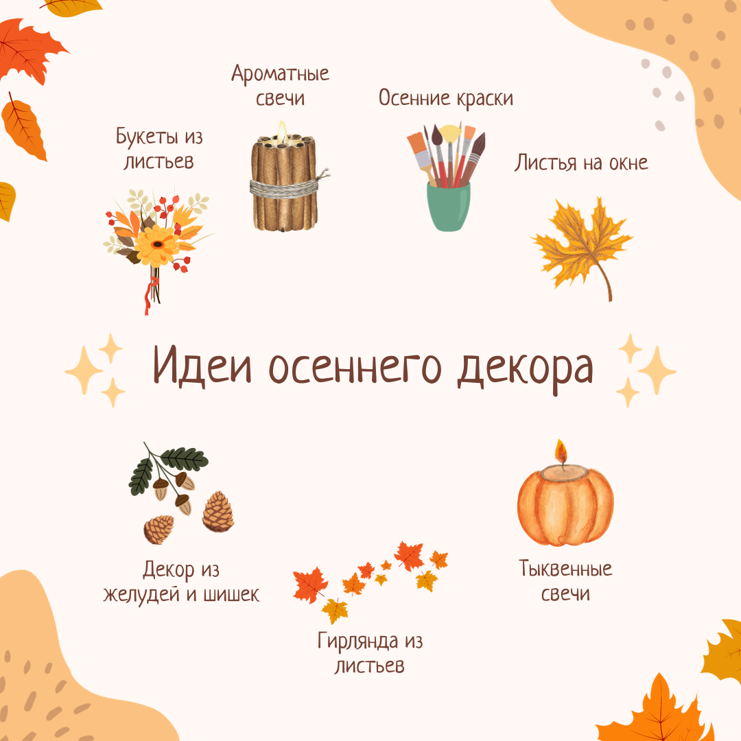 Желтые листья, желуди, шишки и даже ветки могут стать вашими верными помощниками в подготовке интерьера к осени. Предлагаем вам вдохновиться осенней красотой на творчество и сделать уникальные украшения для дома собственными руками. Идеи осеннего декора Ароматные свечи Добавьте уют и пряный аромат вашему дому, украсив свечу палочками корицы, обвязав их вокруг свечи при помощи веревочки. Букеты из сухих листьев Соберите разноцветные осенние листья и создайте из них красивый букет или венок. Это отличный способ добавить осенний акцент в интерьер. Декор из желудей и шишек Жёлуди, листья и шишки можно использовать для создания оригинальных аксессуаров для дома, таких как венки, подставки и гирлянды. Листья на окне На оконные стекла наклейте засушенные желтые листочки из гербария. А если в вашем интерьере есть стеклянные перегородки или столешницы, можно задекорировать и их. Осенние краски Часть домашнего декора можно покрасить в теплые осенние цвета, такие как оранжевый, бордовый и желтый.