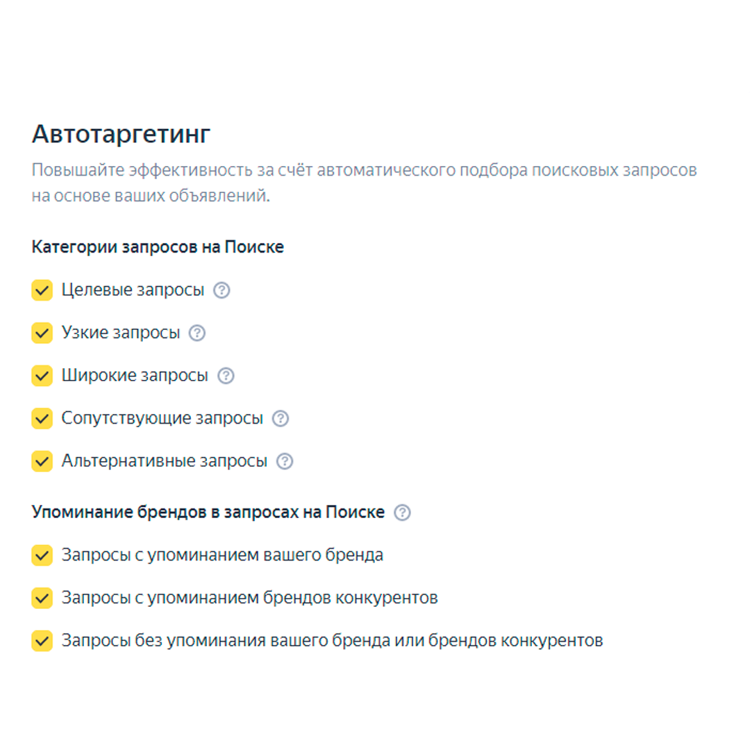 Яндекс Реклама ввела 28 сентября 2023 года обязательный автотаргетинг во вновь созданные текстово-графические кампании на Поиске. Теперь при запуске рекламы в вышеуказанном формате необходимо выбрать хотя бы одну категорию автотаргетинга: целевые запросы, узкие, широкие, сопутствующие, альтернативные или брендовые.