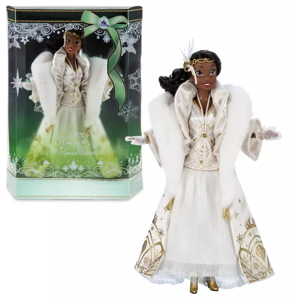 В новом 2024 году праздничной куклой стала Тиана из "Принцесса и лягушка". Выход Тианы планируется на осень 2023 год. Кукла будто Снежная Королева, но добрая. Упаковка мне напоминает приход Малефисенты (ха-ха), но на самом деле авторы задумывали северное сияние, рамкой идут белые снежинки и пурга. Кукла одета в белое ретро платье с золотой вышивкой. На ней плиссированная юбка, золотые кисточки на белой шубке, сама шуба на подкладке из искусственного меха, также отделка драгоценными камнями, на ней кружевные перчатки с золотыми линия, ожерелье из искусственного жемчуга и тиара на голове золотого цвета с белыми перьями. У Тианы золотые туфли. Лицо у куклы с широкой улыбкой, губы темного алого цвета, а на веках золотые тени. Волосы уложены в красивую ретро прическу.