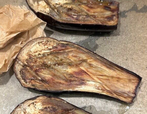 Моем, подсушиваем и разрезаем баклажаны пополам. Делаем неглубокие надрезы крест накрест, немного солим, сбрызгиваем оливковым маслом и отправляем в духовку, разогретую до 220°C, на 40–45 минут. Даем им немного остыть.