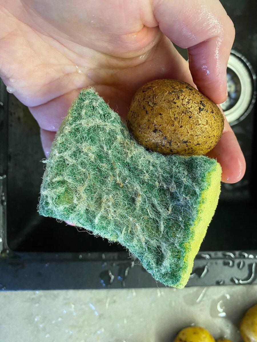 Ни в коем случае не хочу раздавать советов, возможно вы уже так делаете, но хочу поделиться нашим способом. Молодую картошку мы готовим так: Мы ее не чистим, а берем губку для мытья посуды и жесткой стороной трем картофелины. И получается чистая и без жесткой шкурки картофелины Чистую картошку складываем в форму в фольгу. Промазываем ее оливковым маслом, соль и тимьян. Закрываем фольгу и в духовку на 40 минут на 160 градусов. Очень вкусно!