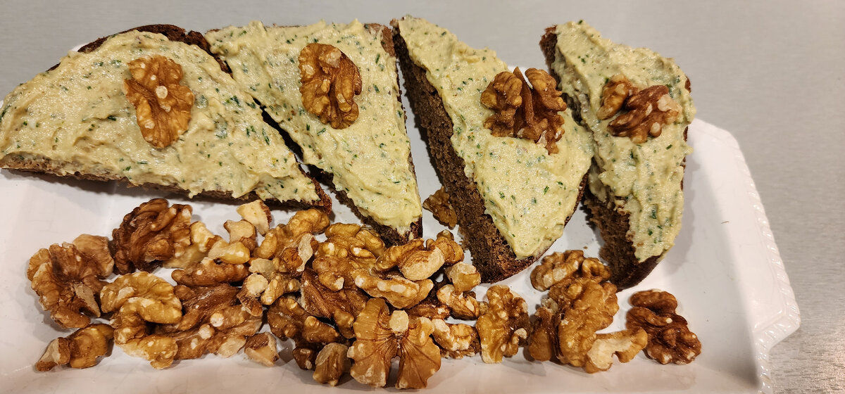 3 ) варёных яйца. 100 г.) сливочное масло. 2-3) зубчик чеснока. грецкий орех. укроп. соль перец по вкусу. взбиваем на блендере, до состояния паштета. чёрный хлеб, булки лаваши по вкусу 😋 очень полезный вкусный 😋 и бюджетный бутерброд на завтрак) приятного аппетита 🤗 всем добро~~~~~~☀️