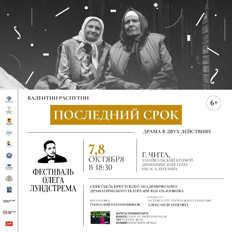 7 и 8 октября Иркутский драматический театр им. Н.П. Охлопкова представит спектакль по повести Валентина Распутина «Последний срок» на сцене Забайкальского краевого драматического театра им. Н. А. Березина. Премьера драмы в двух действиях в постановке Геннадия Шапошникова состоялась 3 апреля 2008 года. За эти годы спектакль заслужил множество наград, в том числе федерального и международного уровня. Этот спектакль — своеобразный реквием крепкой русской семье. Мы видим уход целой эпохи, когда маленький домик был полон детьми, а родные друг другу люди держались заодно. Сегодня каждый сам по себе. «Роль старухи Анны стала для меня настоящим откровением, - призналась актриса драмтеатра Наталья Королева. – Мне даже не пришлось вживаться в эту роль, настолько легко и естественно она мне далась. Я ведь сама выросла в деревенской среде, среди простых людей, поэтому и обстановка спектакля для меня привычна и естественна. За плечами у меня больше 100 ролей и среди них немало ролей простых дереве