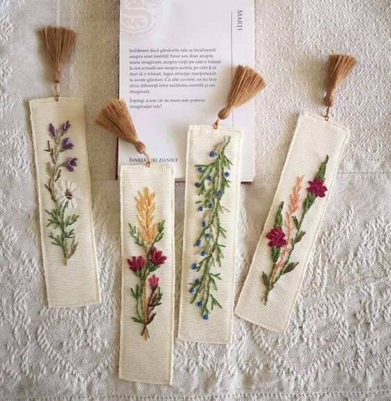 Например, закладки из фетра или войлока. Купить этот материал можно хоть в рукодельных магазинах, хоть в интернете, хоть на Алиэкспрессе. Использовать лучше полужесткий фетр толщиной 2 мм (можно 1 мм, но тогда желательно использовать подложку фетра, на которую будут крепиться детали аппликации). Соединять детали можно клеем "Момент" или с помощью клеевого пистолета, а можно все детали сшивать вручную или на машинке. И, конечно, желательно добавить элементы вышивки: