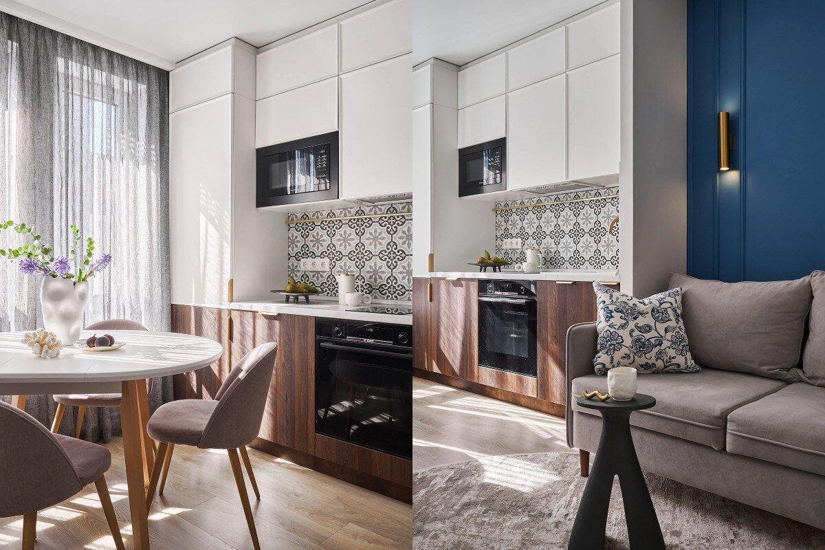 В настоящее время очень популярен стиль минимализма, и при создании фартуков все чаще используются материалы, которые ассоциируются с камнем, такие как каменные столешницы или керамогранитные плиты. Это придает интерьеру красоту и эффектность, но в моей подборке я также представляю разнообразные варианты с использованием различных видов плитки и других материалов. Вдохновитесь идеями, которые предлагают дизайнеры для создания фартуков. Плитка с рисунком Для придания кухне заметного стиля выбирайте плитку с интересным рисунком, но не забывайте о его актуальности. Традиционные мотивы, такие как чашки кофе, кофейные зерна или фрукты, давно ушли из моды. Сегодня актуальны геометрические узоры или дизайны, напоминающие восточные мотивы или метлахи, подобные тем, что представлены в проекте дизайнера Дженнет Койтемировой. Эти стили будут актуальными еще долгое время. Плитка с декоративным «кантом» В проекте от студии Bilbao Design фартук на кухне гармонично сочетается с отделкой пола. Использ