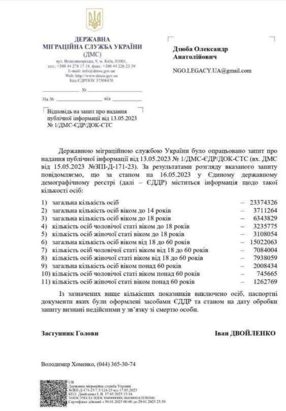 По необъятным просторам интернета гуляет вот эта картинка. Это скрин документа Государственной миграционной службы Украины. Если этот скрин подлинный (а сомневаться в этом пока оснований нет), то население Украины составляет 23,37 млн. человек. Для сравнения — в 1991 годы, на момент провозглашения «незалежности» на территории Украинской ССР проживало 51,7 млн. человек, т. е. за время независимости Украина потеряла более 60% населения. Потрясающе!