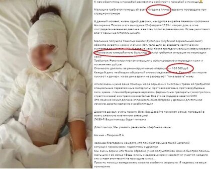 Сбор средств на операцию для псковской 4-летней девочки Алисы, серьезно пострадавшей в пожаре, оказался мошеннической уловкой. Вымышленной – потому что никакого пожара 26 февраля 2023 года на окраине города с госпитализированными ребенком и мужчиной службами ГУ МЧС России выявлено не было. Самый громкий пожар в Псковской области в этот день случился на Талабских островах. Его быстро потушили и никто не пострадал. «Малышка получила тяжелые ожоги (3) степени (глубокий дермальный ожог) обожгло животик, ножки и ручки – 35% тела. Для ее возраста критическим считается показатель 20%. В первые часы после трагедии малышку эвакуировали в Псковскую межрайонную больницу. Срочно нужна операция по пересадке кожи», – заклинают мошенники. Стоимость такой операции – 165 000 рублей и номер карты, куда высылать деньги – тоже указано. Редакция «Комсомольской правды в Пскове» связалась с комитетом по Здравоохранению Псковской области, где подтвердили вымышленность ситуации и явный обман. «Мы о такой ситу