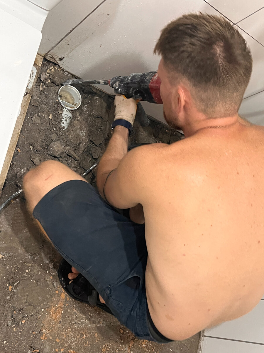 Не было печали после заселения в квартиру и вдруг....стали обращать внимание, что стена со стороны подъезда (которая граничит с нашей квартирой) стала мокнуть. Сначала появилось маленькое пятнышко и постепенно оно начало расти... Мы выяснили, что эта часть идеально совпадает с нашей душевой, а значит проблема где-то в душевой. С учетом того, что мы давно подумывали заменить пол в ванной из-за неправильно сделанного уклона (благодаря этому после душа воду приходилось сгонять щеткой, иначе она просто стояла на полу), решение было принято в пользу самостоятельного вскрытия пола. Конечно, в идеале хотелось снять всю эту креативную плитку от турецкого застройщика и выложить не только пол, но и стены плиткой спокойных цветов, но.... Поскольку цены на плитку (как и на многое другое) значительно выросли и нам не хотелось тратить много времени и денег на ремонт, то решили сделать замену плитки только в зоне душа. После вскрытия плитки оказалось, что наше решение было правильным - весь клеевой с