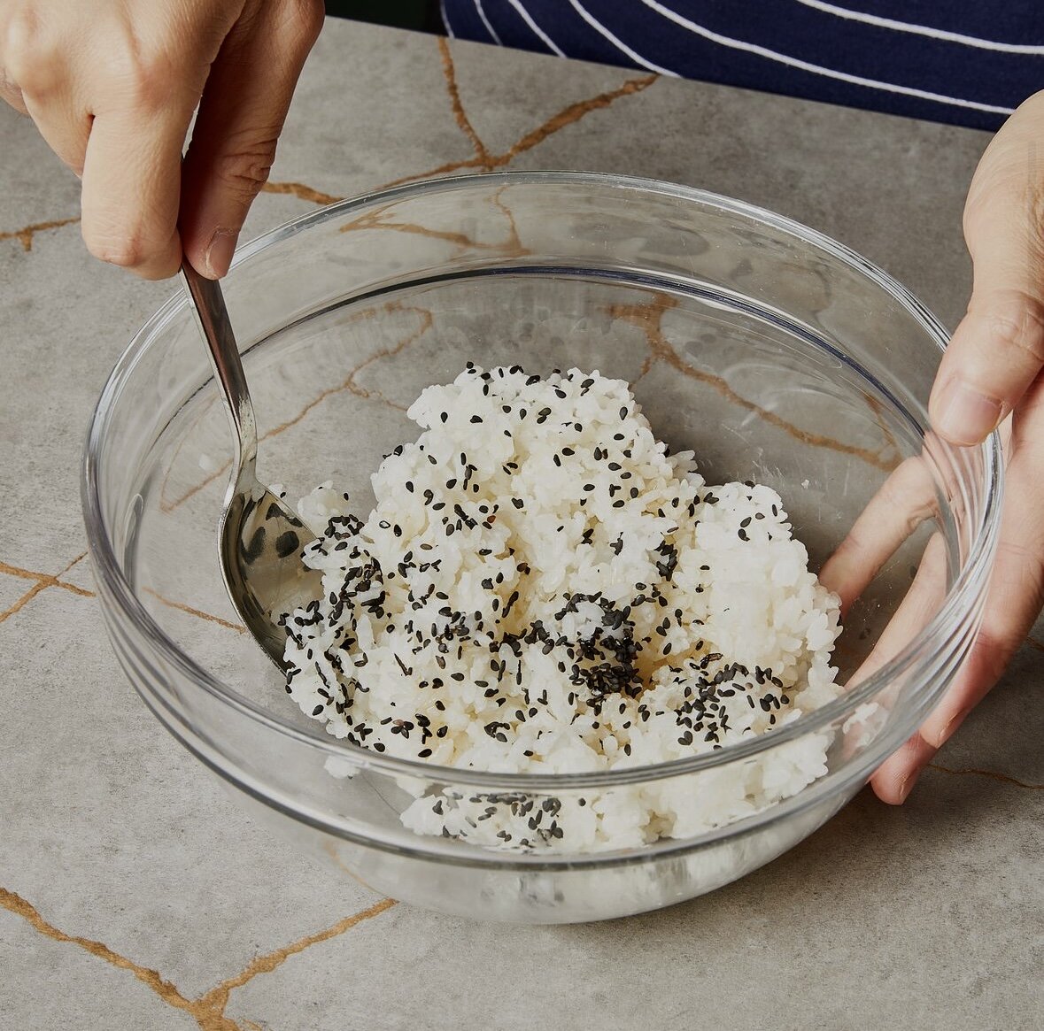 - В большой миске соедините приготовленный суши рис, одну чайную ложку кунжутного масла, черные семена кунжута и щепотку соли. Хорошо перемешайте.