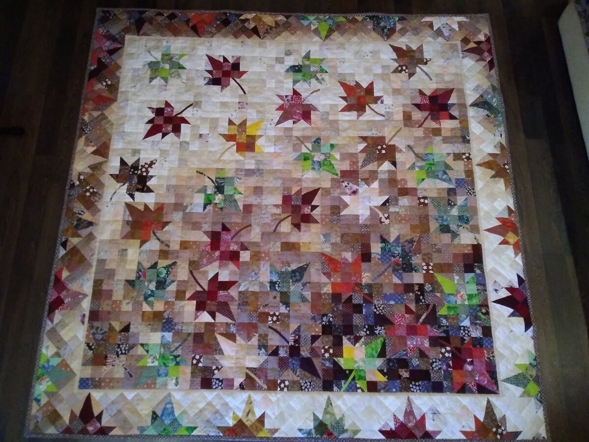 Самое красивое не обязательное должно быть сложным. Правда, бывает, что выполненное замысловато, мастерски, заставляет внутренне воскликнуть: "Как красиво!" Сегодня будет и прекрасная простота, и вдохновляющая сложность. Время показывать ваши лучшие работы, дорогие подписчики! Напомню, что по понедельникам в группе "Я люблю пэчворк" ВКонтакте вы делитесь фотографиями готовых квилтов или процессов, а я в Дзене делюсь фотографиями пяти самых популярных работ, набравших наибольшее количество сердечек и комментариев. Вообще-то, я голосую за всех участников Хвастливых Понедельников, но если бы можно было бы поставить два, три, пять лайков этому одеялу, я бы это сделала! Его сшила подписчица под ником Наталья Наталья. Настоящий листопад, разнообразие красок. Особенно потрясает градиент, Наталья отлично поработала с тканями, а точнее, с их светлотой. Также мне нравится сочетание прямой и диагональной раскладок. Ну, и чтобы совсем нас "добить" - информация со страницы Натальи. 93 ткани! 23