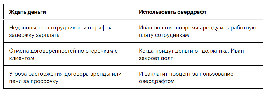 Обычно к овердрафту прибегают предприниматели, у которых появляются только краткосрочные потребности в дополнительных деньгах. Вот и у нашего Ивана было два варианта развития событий: ждать деньги дальше или подключить овердрафт.