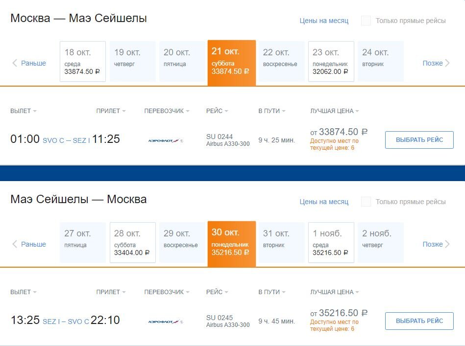 Если билеты брать отдельно, стоимость составит от 69 тысяч рублей на человека туда-обратно на конец октября - сегодня это самый быстрый способ добраться до Маэ. Тариф минимальный, без багажа, его можно добавить отдельно при бронировании. Полёт длится около 9,5 часов.