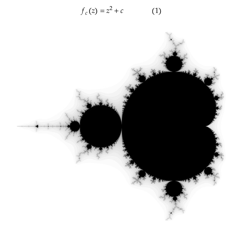 "Множество Мандельброта определяется как набор комплексных чисел c, для которых функция (1) не расходится при итерации [начиная] от z=0... Для достижения лучших визуальных результатов при вычислении фрактала отдельным пикселям сгенерированного изображения присваивается цвет в зависимости от того, сколько итераций требуется, чтобы превысить фиксированное пороговое значение, например 4, что формирует цветовой градиент и создает интересные узоры. Пикселям, значения функции для которых не расходятся (не превышают порогового значения после вычисления определенного количества итераций), может быть присвоен специальный цвет, чтобы отличать их от остальных пикселей. Каждый пиксель может быть вычислен независимо, что позволяет аппаратно сгенерировать фрактал в виде потока независимых пикселей. Пример множества Мандельброта с цветным окружением в оттенках серого можно увидеть на рисунке..."
