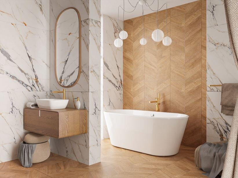 Сочетание керамогранита под мрамор и дерево делает интерьер стильным и современным. Используйте в качестве основы плитку под мрамор, она придаст интерьеру особое благородство. Керамогранитом под дерево можно зонировать часть интерьера, например, душевое пространство или отдельную стену. В отличие от натурального дерева, керамогранит обладает стойкостью к влаге и внешним воздействиям, а также износостойкостью и долговечностью.