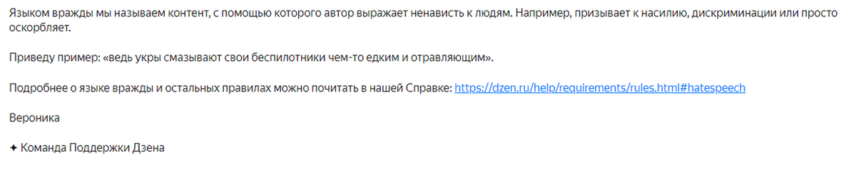 Ответ из "техподдержки" Дзена, которая лично меня ни разу не поддержала, и вообще сомневаюсь, что она хоть кому-то способна оказать реальную помощь своими иезутскими цитатами из правил, которые сами же и нарушают. Вот где здесь оскорбление, в каком месте? Укры сами себя украми называют, и даже гордятся этим - это факт. Укры смазывают свои беспилотники, которыми бомбят мирные дома на территории России, отравляющими веществами - и это факт, о котором уже написано не раз и где-только можно, в том числе и в солидных изданиях. И то, что Дзен проводит русофобскую политику, репрессируя пророссийские каналы - тоже факт. И то, что это именно политические репрессии, а не забота о нежных читателях - тоже факт, который подтверждается тем, что на Дзене можно публиковать любую гадость, от пропаганды гомосексуализма, педофилии и русофобии до банального шок-контента и просто ворованных с ТикТока видосов, у которых уже невозможно определить авторства - то есть, никакой заботы о читателях на Дзене нет