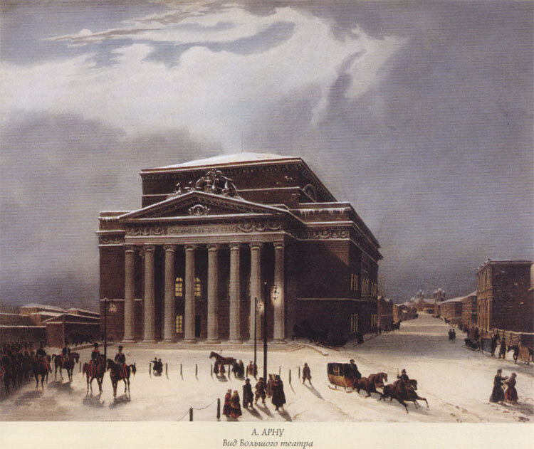 Это один из символов российской культуры. Здесь выступали Михаил Щепкин и Павел Мочалов. Казённый театр Датой основания Большого театра принято считать 28 марта 1776 года. Именно тогда императрица Екатерина II подписала «привилегию» князю Урусову на содержание «театрального всякого рода представлений, а также концертов, воксалов и маскарадов». И императрица вовсе не имела в виду железнодорожные станции: раньше «воксалом» называли сад, где проходили разного рода увеселения. Слово это произошло от названия «Воксхолл», парка для гуляний под Лондоном. Как бы то ни было, дело у Урусова на лад не пошло: едва князь успел построить театр, как здание сгорело. Дело передали в более надёжные руки английского предпринимателя Медокса. Он с заданием справился и построил театр на Петровке (именно поэтому Большой раньше называли Петровским театром), одной из самых старых улиц Москвы. Современное здание Большого театра построили в начале Петровки в 1824 году. Большой театр, рисунок 19 века. (wikipedia.