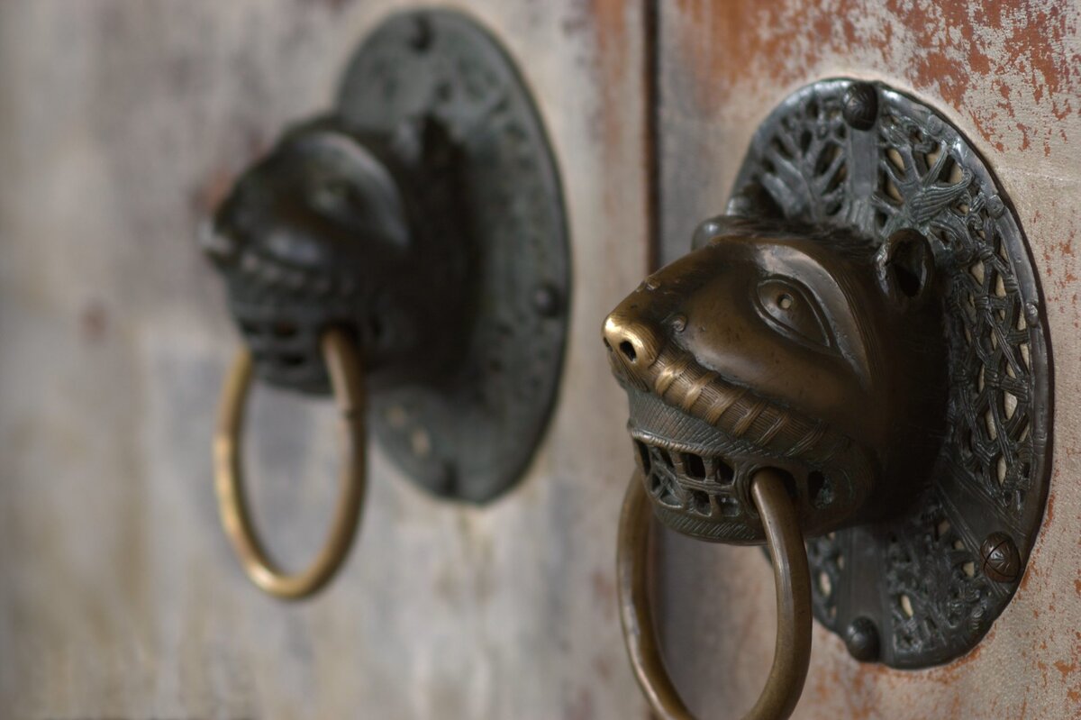 Самая популярная дверная ручка-гонг из металла имеет основание в виде быка и ударный механизм в виде кольца, висящего на носу или во рту этого сильного животного. Она использовалась во многих художественных фильмах. Сегодня можно купить такую модель в разных расцветках, размере и материале. Её часто вешают на ворота дверей или даже на фасад дома в качестве декора. Второй по популярности мотив – голова льва. Это животное отражает свободолюбие, власть и силу.