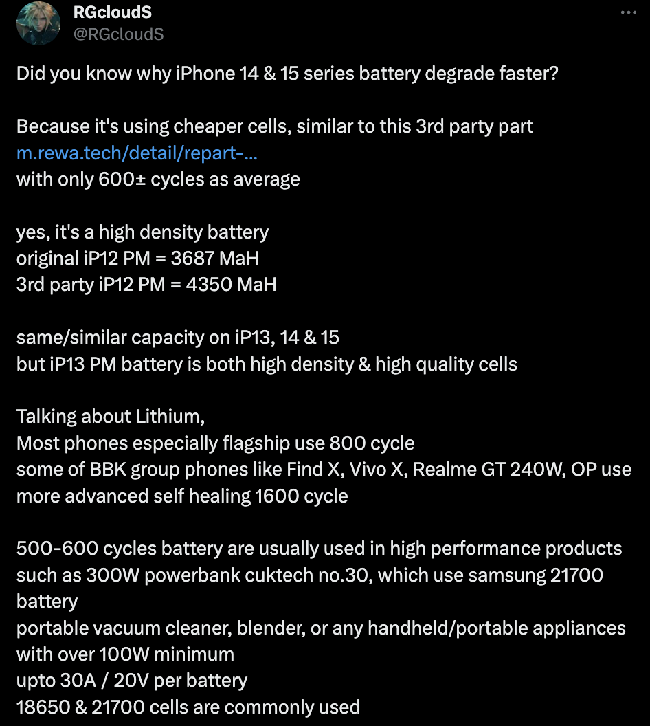 Пользователи неоднократно жаловались на быстрое снижение здоровья батареи iPhone 14 всего через несколько месяцев использования. Согласно слухам, новейший iPhone 15 может столкнуться с аналогичной проблемой. Инсайдеры утверждают, что новые модели оснащены более дешевыми батареями, рассчитанными всего на 600 циклов зарядки. Как отмечает RGcloudS, батареи с выносливостью 500-600 циклов зарядки обычно используются в высокопроизводительных устройствах, таких как внешние аккумуляторы, пылесосы и другие портативные продукты, поддерживающие до 100W мощности. Поскольку линейка iPhone 15 не может быть отнесена к высокопроизводительным устройствам (она не поддерживает 100W), использование батарей с 600 циклами зарядки может указывать на стремление Apple сократить расходы. Стоит отметить, что iPhone 15 Pro Max на $100 дороже предыдущей модели iPhone 14 Pro Max, но при этом базовая версия предлагает вдвое больше объема памяти и ряд других апгрейдов. RGcloudS также утверждает, что китайские бренды,