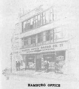 C 1906 года дистрибьюторский центр компании "Gillette" в Германии находился в Гамбурге. Во время Первой Мировой войны он по понятным причинам не работал. Единственное фото гамбургского офиса найдено в юбилейном номере корпоративного журнала "Gillette Blade", выпущенного в 1926 году к 25-летию компании. Изображение было жёлто-белым(!), я сделал, что мог.