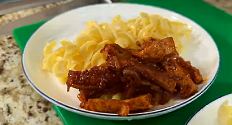 Очень вкусное мясо, которое можно быстро и легко приготовить на ужин. Только мясо надо брать достаточно жирное, свинину или баранину. Тогда вкус получается просто изумительный. Такое мясо можно подать с любым гарниром, и не забыть добавить салат из свежих овощей. Ингредиенты: 1) Мясо ( у меня свиная корейка ), порезанное небольшими полосками - 500 г 2) Лук репчатый, нарезанный полукольцами - 200 г 3) Масло растительное - 20 г 4) Томатная паста - 1 столовая ложка 5) Вода - 1 столовая ложка 6) Уксус яблочный - 1 столовая ложка 7) Соевый соус - 2 столовые ложки 8) Чеснок сушеный - 0.5 чайной ложки 9) Соль - по вкусу Приготовление: 1) Нарезанное мясо подсолить, влить в него 10 граммов подсолнечного масла из указанных, перемешать хорошо, желательно руками. 2) В нагретую сковороду с толстым дном влить оставшееся масло и выложить мясо. Обжаривать мясо с двух сторон на сильном огне без крышки, по 3 минуты с каждой стороны, далее переложить его на тарелку. 3) В ту же сковороду выложить лук и та