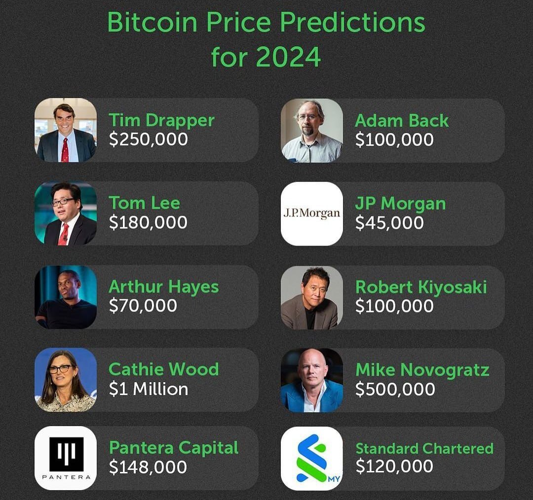 А для этого публикуем картинку, в которой отражены прогнозы цены BTC, некоторых известных аналитиков, управляющих и фондов на 2024 год За одно обсудим кто из них еба..лся в край