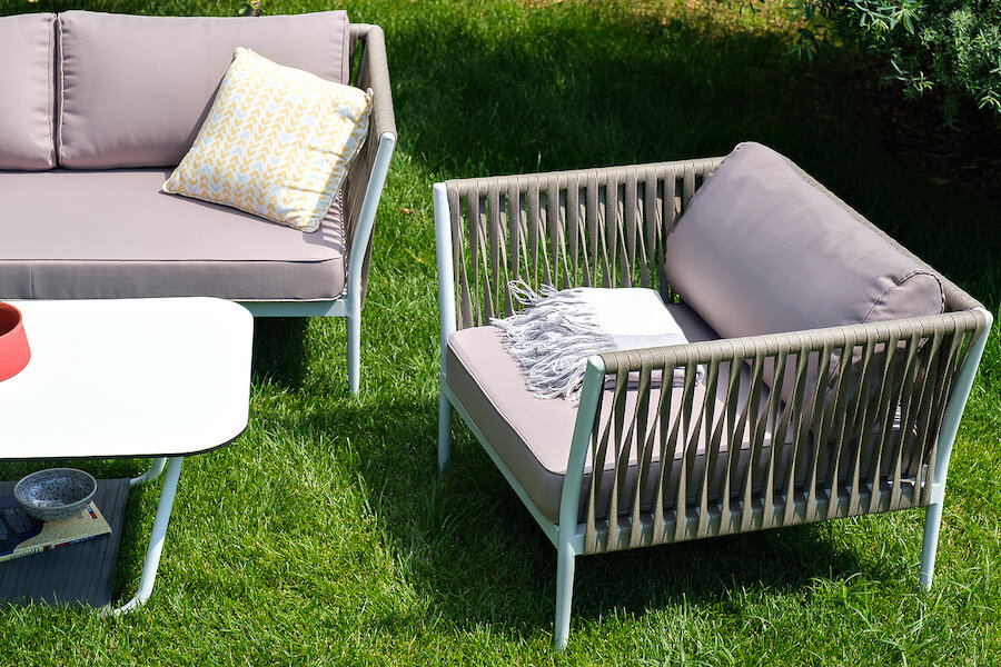 Во-вторых, кресла из роупа на алюминиевом каркасе не боятся влаги, ультрафиолета, уличной пыли и бытовых загрязнений: проливной дождь и палящее солнце не навредят алюминию (он не покроется ржавчиной и не начнет рассыхаться), а отмыть пятна от соков, кофе или вина можно при помощи обычного мыльного раствора и воды. Неудивительно, что этот вариант часто выбирают семьи с детьми и домашними питомцами, а также рестораторы и отельеры.