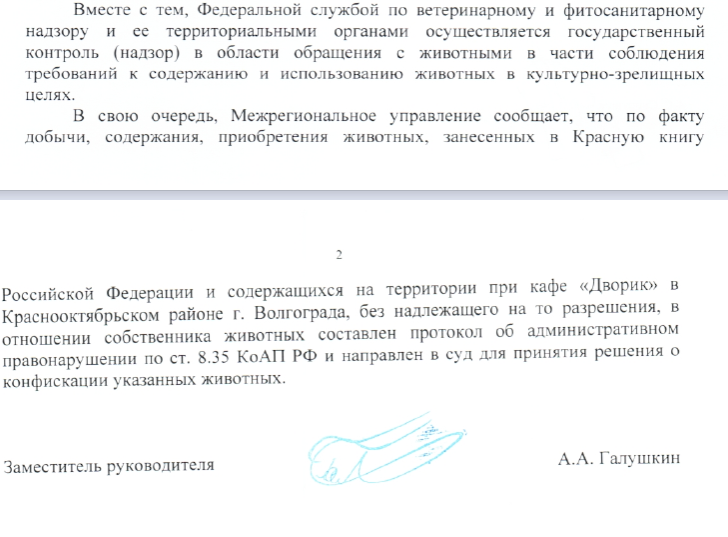 3 октября пришел ответ из межрегионального управления Росприроднадзора. Известно, что еноты-полоскуны, которые содержатся при кафе в жутких условиях, занесены в Международную Красную книгу, и находятся во «Дворике» без надлежащего разрешения. В отношении собственника составлен протокол об административном правонарушении по ст. 8. 35 КоАП РФ: «Уничтожение редких и находящихся под угрозой исчезновения видов животных или растений». Он направлен в суд для принятия решения о конфискации животных.