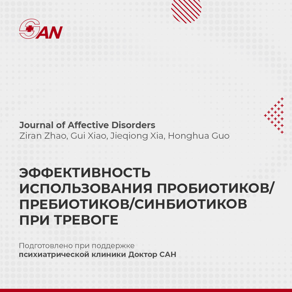 Метаанализ был направлен на оценку влияния вмешательств, которые изменяют микрофлору кишечника (включая пробиотики, пребиотики и синбиотики) на тревогу. Результат показали, что пробиотики и синбиотики могут снизить показатели тревожности; однако, преждевременно делать вывод об их клинической эффективности в облегчении тревоги из-за небольшой величины эффекта. Не существует единого мнения относительно оптимальной дозы, продолжительности лечения, типа лечения или штамма пробиотиков для снижения тревожности. Более того, механизмы, с помощью которых пробиотики и синбиотики снижают тревожность, остаются неясными. Подробнее о лечении ГТР: https://doctorsan.ru/generalizovannoe-trevozhnoe-rasstroystvo