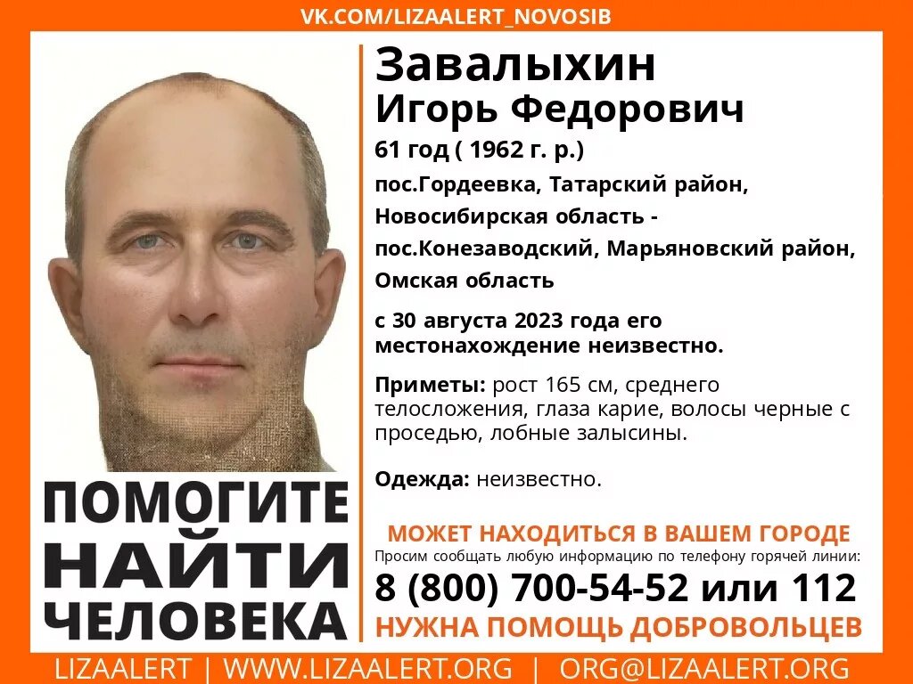 В Татарском районе Новосибирской области 30 августа пропал 61-летний Игорь Завалыхин. Об этом сообщили волонтеры поисково-спасательного отряда «ЛизаАлерт». Уточняется, что мужчина мог находиться в поселке Гордеевка в Татарском районе или же в поселке Конезаводской Марьяновского района Омской области. Однако информации о том, в какой одежде был мужчина — нет. Приметы: рост 165 см, среднее телосложение, карие глаза, черные волосы с проседью, лобные залысины. Если у вас есть информация о местонахождении Игоря Завалыхина, сообщите об этом по телефону ПСО 8—800-700-54-52 или наберите 112. Дмитрий Кузнецов