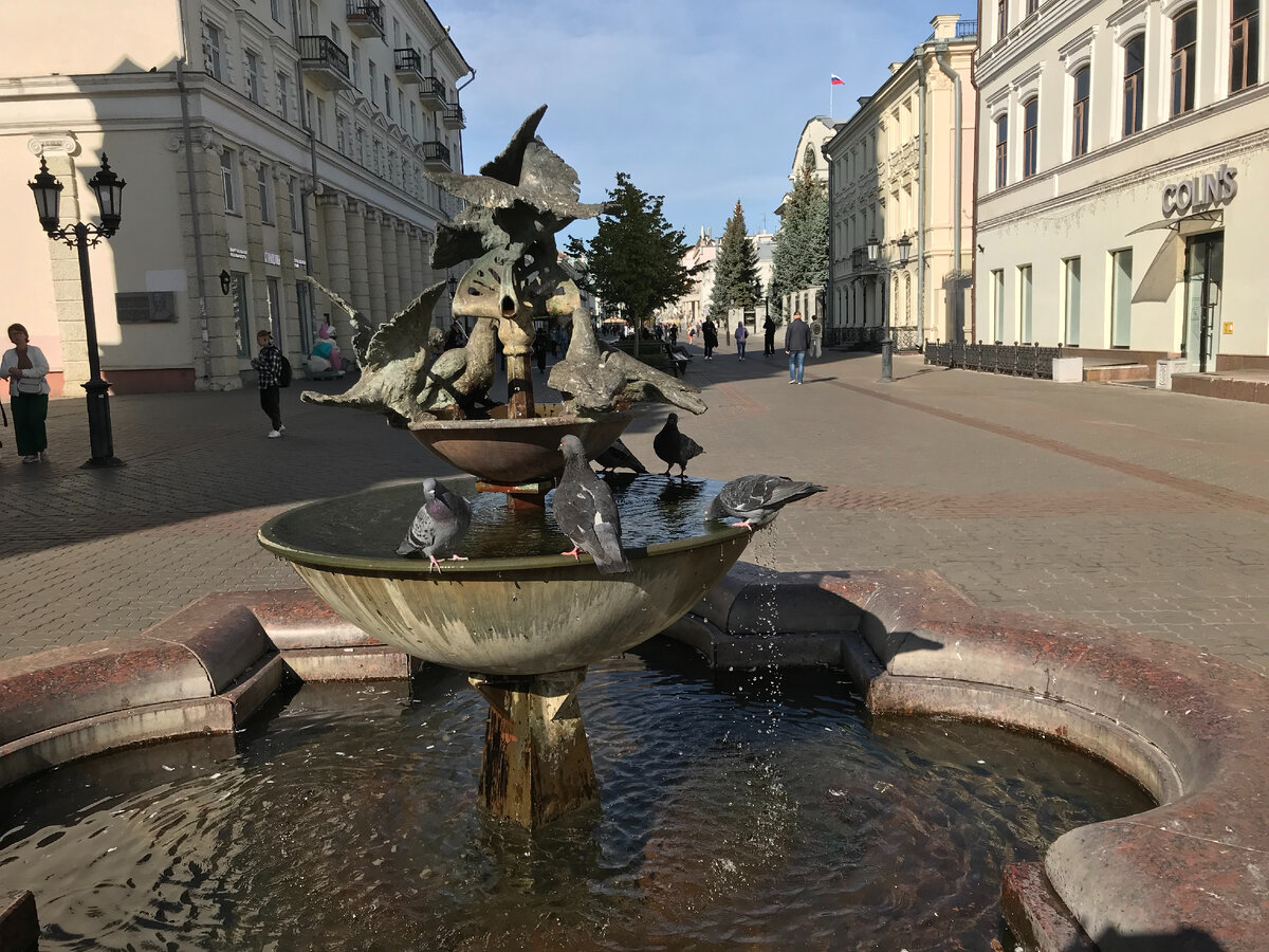 Казань – удивительный город. Он яркий и необычный, самобытный и постоянно меняющийся. В этом городе есть достопримечательности на любой вкус. Можно встретить представителей сказок и легенд, представленных в контактной скульптуре. А еще здесь много фонтанов. Фонтаны горизонтальные, вертикальные, маленькие и большие, танцующие и поющие. По старому центру города проходит пешеходная улица – улица Баумана. Улица эта длинная и интересная. Здесь и музыканты выступают, и художники рисуют, и сувениры продают. А еще на этой улице установлены небольшие сюжетные фонтаны, которые привлекают туристов, радуют прохожих, приводят в восторг детей и дают возможность напиться птицам. Я прошла мимо всех фонтанов и хочу их показать.