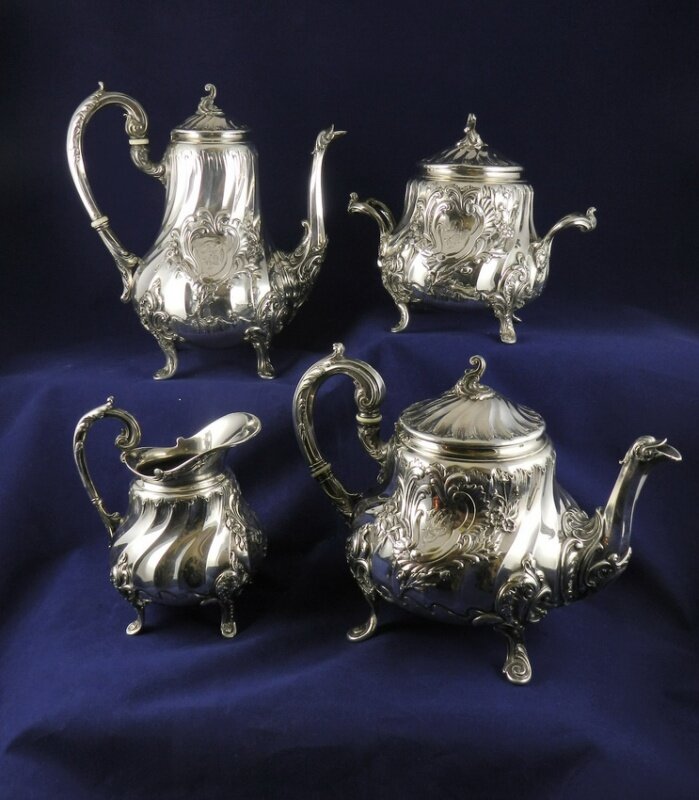 Антикварный серебряный Чайно-кофейный сервиз из четырех предметов «La Maison Aucoc» конца 19-го века находится в антикварной галерее Бульвар де Лис в Москве.