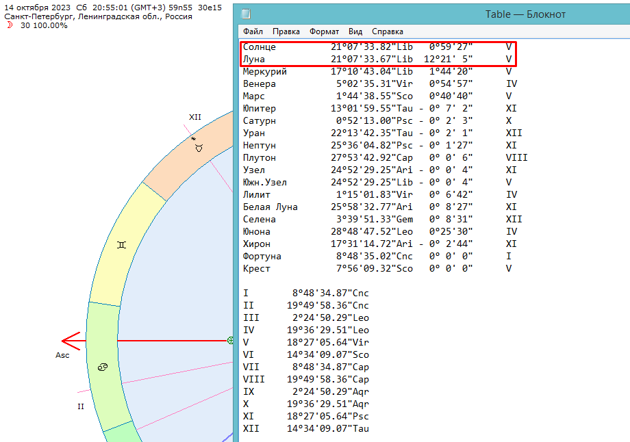 Посмотрите, как это выглядит технически, в программе Zet9, на примере солнечного затмения 14 октября 2023 года: