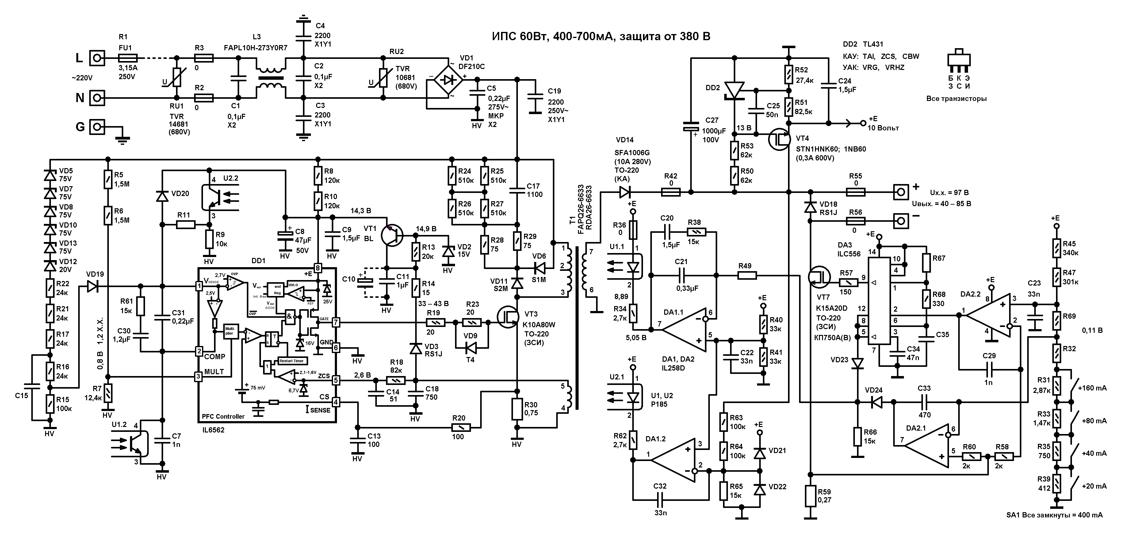 Возможность реализации п.1 обеспечена разделением обратных связей (ОС), отдельно по току (через оптрон U1) и напряжению (через оптрон U2). ОС по напряжению заведена на вход 1 ИМС PFC (DD1). ОС по току оставлена без изменений, заводится на вход 2 ИМС PFC.