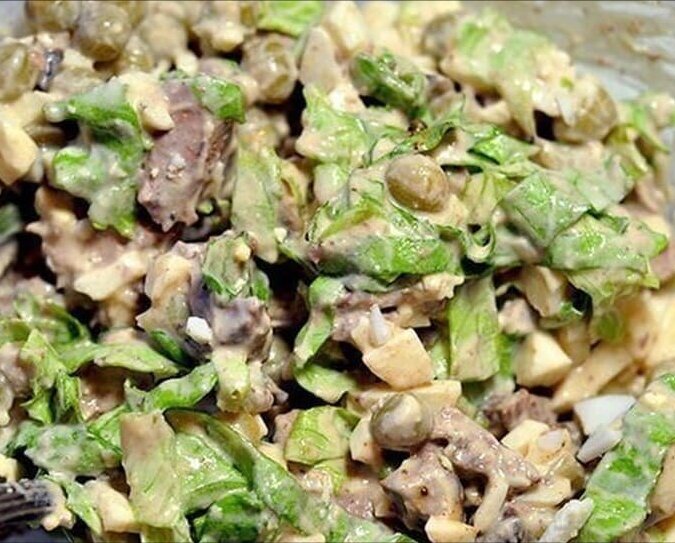 Сытное угощение для всей семьи. Понадобится: Приготовление: Куриную печень отварить до готовности, яйца сварить вкрутую. Лук очистить, нарезать тонкими полукольцами, немного примять руками и замариновать на 10 минут в уксусе. Затем лук отжать, но не промывать под проточной водой. Печень нарезать соломкой. Яйца очистить и нарезать кубиками. В глубоком салатнике соединить маринованый лук, печень, яйца, зелёный горошек. Посолить, заправить майонезом, хорошо перемешать. Перед подачей на стол салат украсить зеленью по желанию. Приятного аппетита!