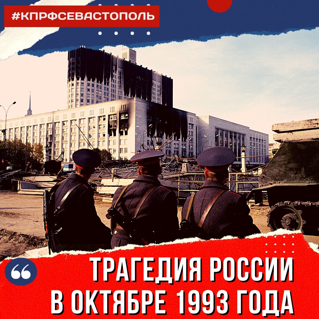 Золотая осень в Москве 1993 года запомнилась трагическими событиями «чёрного октября». Тогда политический конфликт между президентом России Борисом Ельциным и Верховным Советом вылился в вооружённое противостояние. В «Ельцин-центре» г. Екатеринбурга 1993 год представлен, как год рождения новой Конституции России. Но почему-то напрочь замалчивается вопиющий факт нарушения действующей Конституции РФ кровавым президентом Борисом Ельциным. Всё началось 20 марта 1993 г., когда глава государства захотел больших полномочий и заявил о новом порядке управления страной, и о приостановлении действующей Конституции. Через неделю внеочередной Съезд Народных депутатов предпринял попытку объявить импичмент президенту, которая оказалась неудачной. А 25 апреля на демонстрации в поддержку депутатов Верховного Совета пролилась первая кровь. В сентябре Съезд Народных депутатов и Верховный Совет столкнулись с техническими препятствиями в своей деятельности. Большой Кремлёвский Дворец был закрыт на ремонт, и депутаты временно переехали в Белый Дом. В то же время здание Конституционного суда лишили охраны. 21 сентября 1993 года был издан указ президента №1400 о роспуске Съезда Народных депутатов и Верховного Совета. Его поддержали глава правительства России Виктор Черномырдин и мэр Москвы Юрий Лужков. Тогда стало ясно, что назревают серьёзные события. По действующей Конституции 1978 года Президент не имел права упразднять эти государственные структуры власти. Председатель Верховного Совета РФ Руслан Хасбулатов заявил о государственном перевороте. Он вместе с вице-президентом Александром Руцким, который 22 сентября был назначен Верховным Советом — исполняющим обязанности Президента РФ, возглавили сопротивление. Большинство депутатов поддержали сопротивление, которые были против социально-экономической политики президента и правительства. В основном это блок «Российское единство», в который входили представители КПРФ, фракции «Отчизна», Аграрный Союз», депутатская группа «Россия» Сергея Бабурина. В это время под Белым Домом строились баррикады и формировались добровольческие отряды для защиты Верховного Совета. 23 сентября началась осада Белого Дома. В нём отключили свет, воду и отопление. 1-го октября примерить обе враждующие стороны пытался патриарх Московский и всея Руси Алексей II, но соглашение было отвергнуто Верховным Советом. 3 октября сторонники Хасбулатова разблокировали Белый Дом и двинулись на штурм телецентра «Останкино». Отряд генерала Альберта Макашова захватил здание московской мэрии. Воодушевлённые успехом они попытались сходу прорвать оборону «Останкино». Однако здесь разыгралась настоящая трагедия. Отряд спецназа МВД «Витязь» открыл огонь по восставшим. У телецентра завязался бой, в котором были потери как в рядах защитников, так и нападавших. Кроме них там погибли журналисты и случайные прохожие. 4 октября к Белому Дому были подтянуты воинские подразделения и дивизион тяжёлых танков. Начался настоящий штурм Белого Дома, где был применён подлинно нацистский метод про ведения карательных операций, когда эсэсовцы любили снимать на камеру и фотографировать плоды своих злодеяний. Белый Дом расстреливался из танков с трансляцией на центральных телевизионных каналах страны. К вечеру защитники Белого Дома прекрат