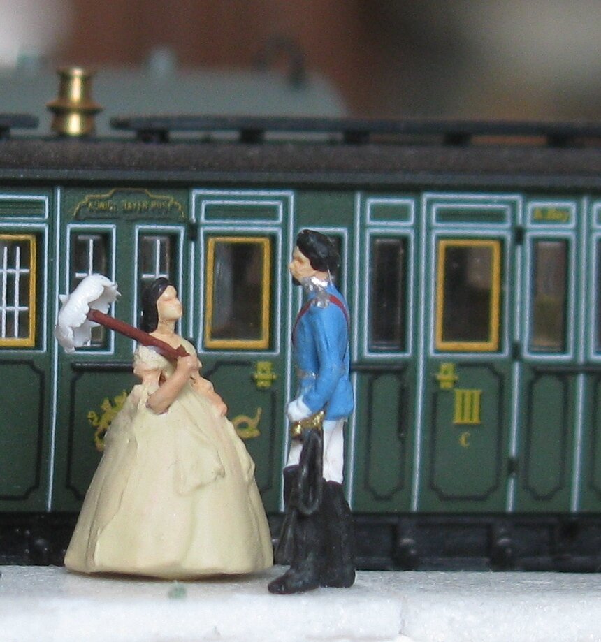 Если говорить честно, то и в этих фигурках есть некое "лукавство": такие широкие платья женщины носили ДО появления железных дорог, когда широкие кареты позволяли войти с таким платьем во внутрь. Поэтому и этих человечков я поставил у вагонов, которые больше походили на кареты: в каждом купе были свои двери на обе стороны и проход вдоль поезда был возможен только по внешним подножкам.