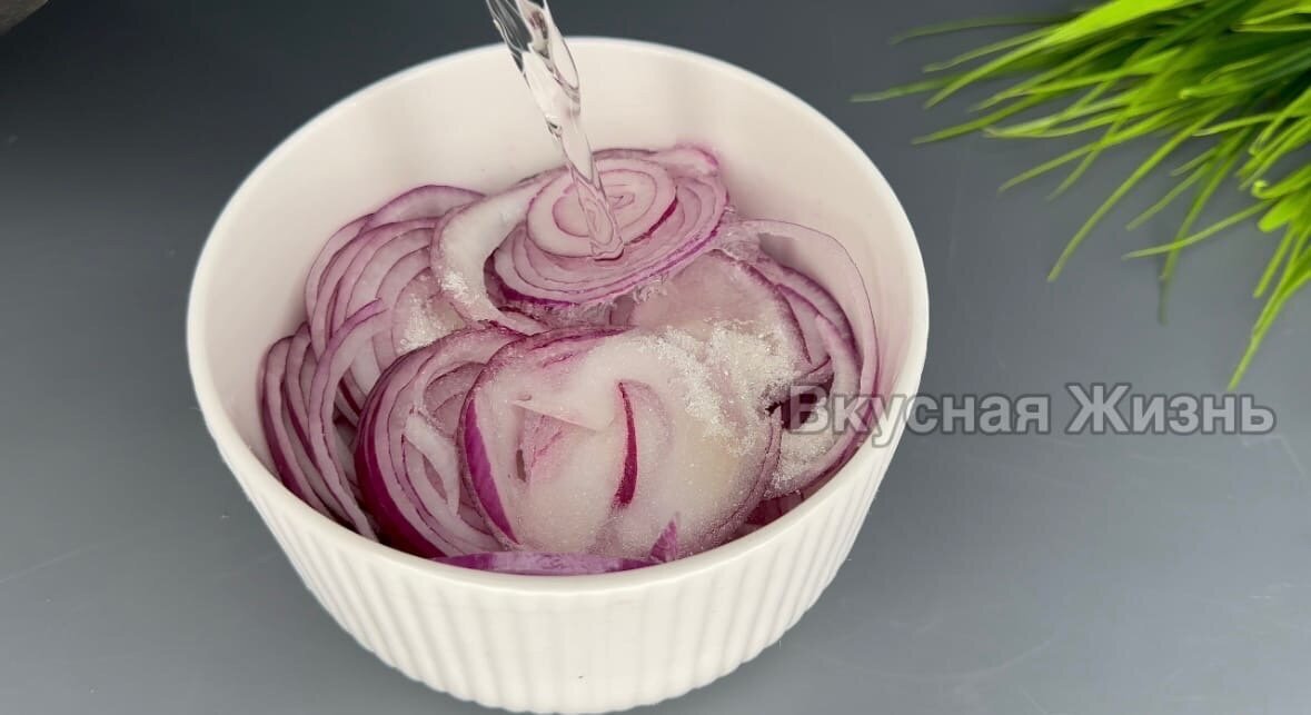 1. Две красные салатные луковицы нарезаем кольцами и перекладываем в небольшую глубокую миску. Добавляем 1 ч. ложку соли, 1 ст. ложку сахара и 2 ст. ложки уксуса 9%. Вливаем воду комнатной температуры, чтобы она слегка покрывала лук. Перемешиваем и маринуем в течение часа.
