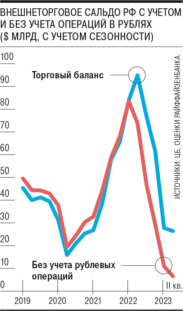 Аналитики Райффайзенбанка исследовали детали платежного баланса РФ за второй квартал 2023 года, опубликованные ЦБ в конце сентября, и влияние статистики внешнего сектора, особенно в части финансового счета, на курс рубля. «Девальвационный тренд в 2023 году все же определяется сужением сальдо баланса товаров и услуг»,— заключили они. Торговый баланс после рекордов 2022 года в 2023-м оказался ниже среднего уровня 2017–2019 годов в $35 млрд — около $30 млрд — и с учетом сезонности во втором квартале мало отличался от первого. «Усилить ослабление курса могла растущая доля рублевых расчетов в части экспорта, без учета которых сальдо все же сократилось»,— считают аналитики банка (см. график). Зарубежные поездки (относятся к импорту услуг) достигли доковидных уровней (более $9 млрд во втором квартале), несмотря на санкционные ограничения. «Хотя размер баланса услуг кратно меньше баланса товаров, его влияние на курс рубля также может быть значимым, в особенности в условиях низкой ликвидности в
